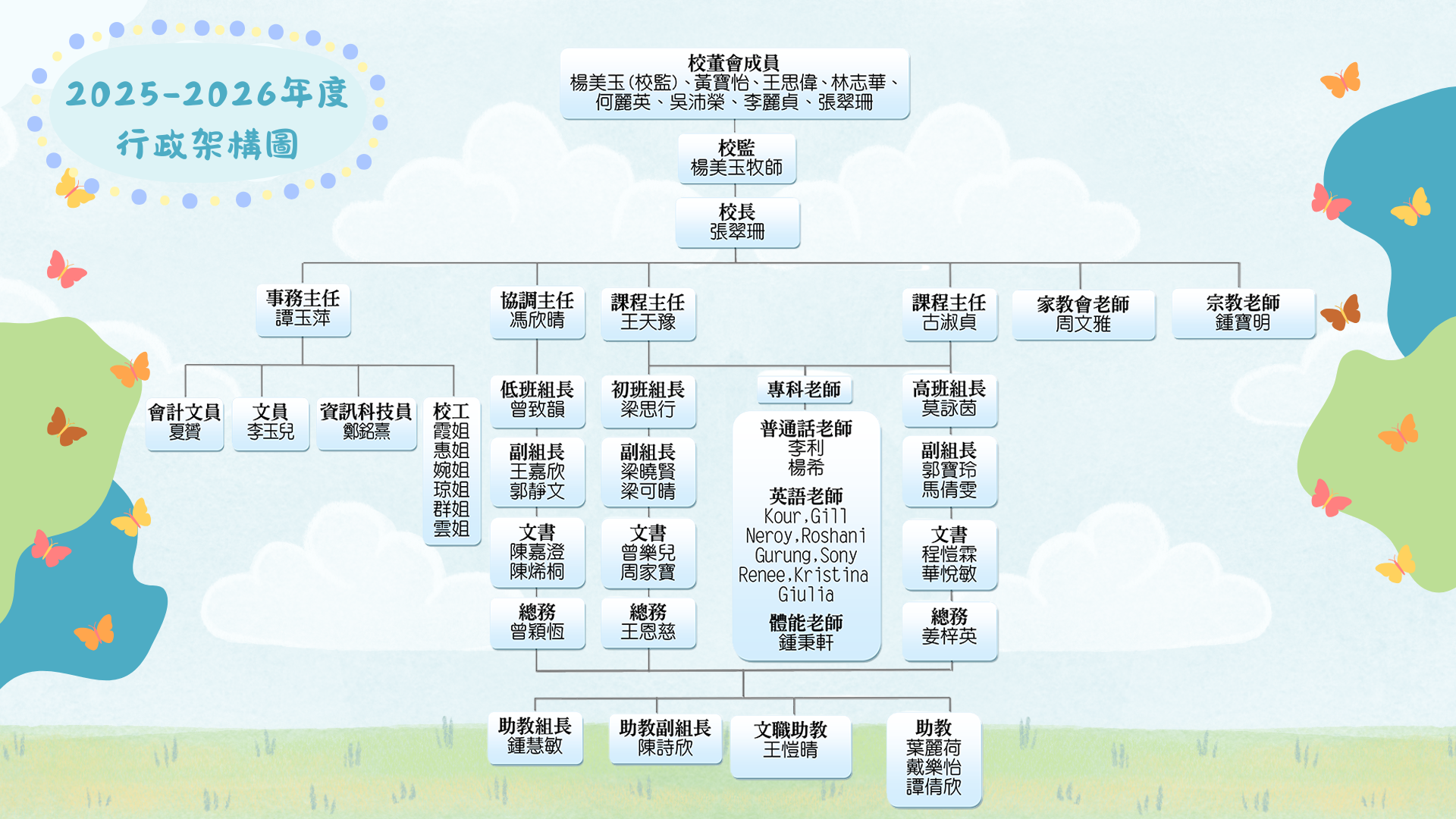 張翠珊校長、王主任(課程主任)、古主任(課程主任)、譚主任(事務主任)、馮主任(協調主任)、周老師(家教會老師)、鍾老師(宗教老師)